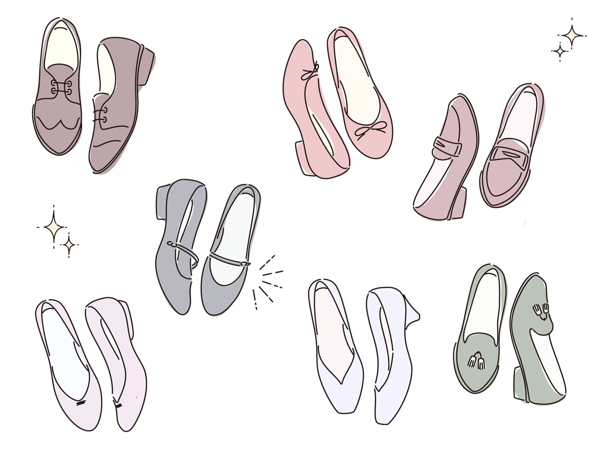 スニーカーやローファーから、ミモザイエローやオフホワイトや若草色をちらり。