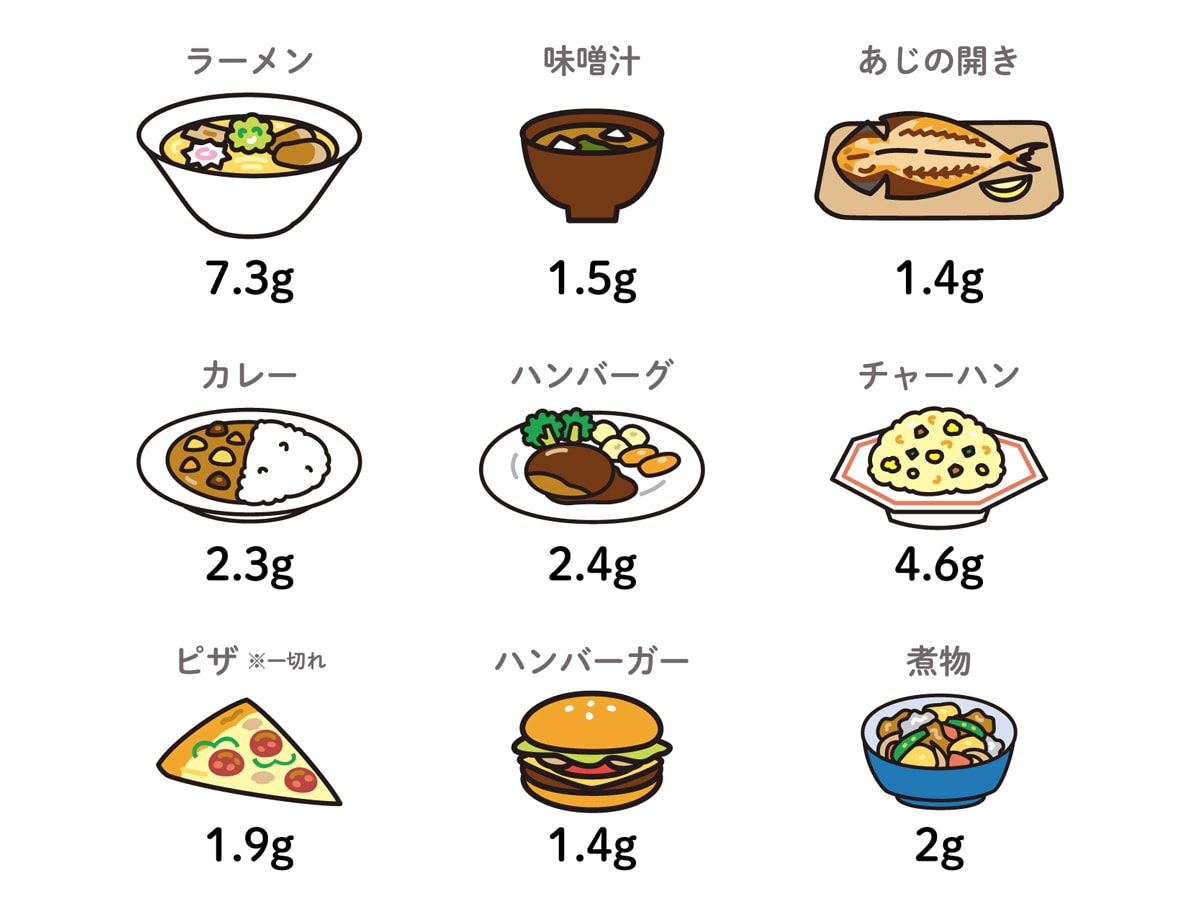 健康な成人の1日の塩分摂取目標量は男性が7.5g未満、女性が6.5g未満です。