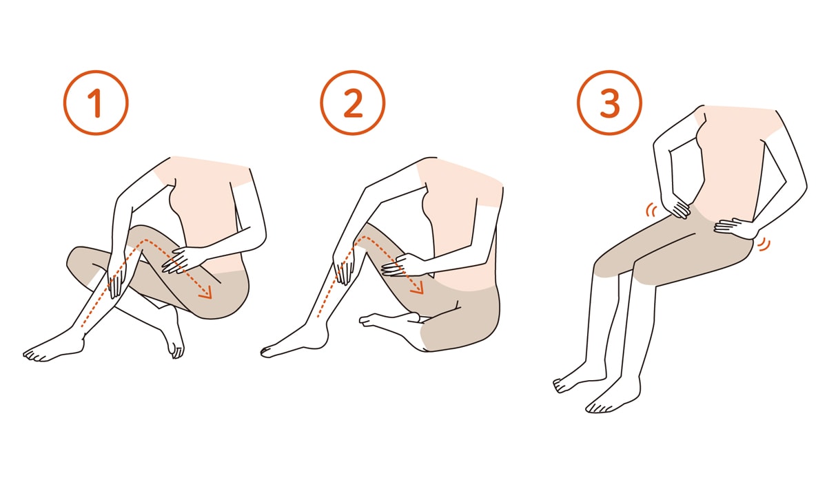 床に座り、膝を軽く立て、外側の足首からふくらはぎ、そして膝裏へ。そのまま太ももへと流しましょう。② 内側の柔らかい部分も同様に③ 仕上げに鼠径(そけい)部のリンパ節へ流す