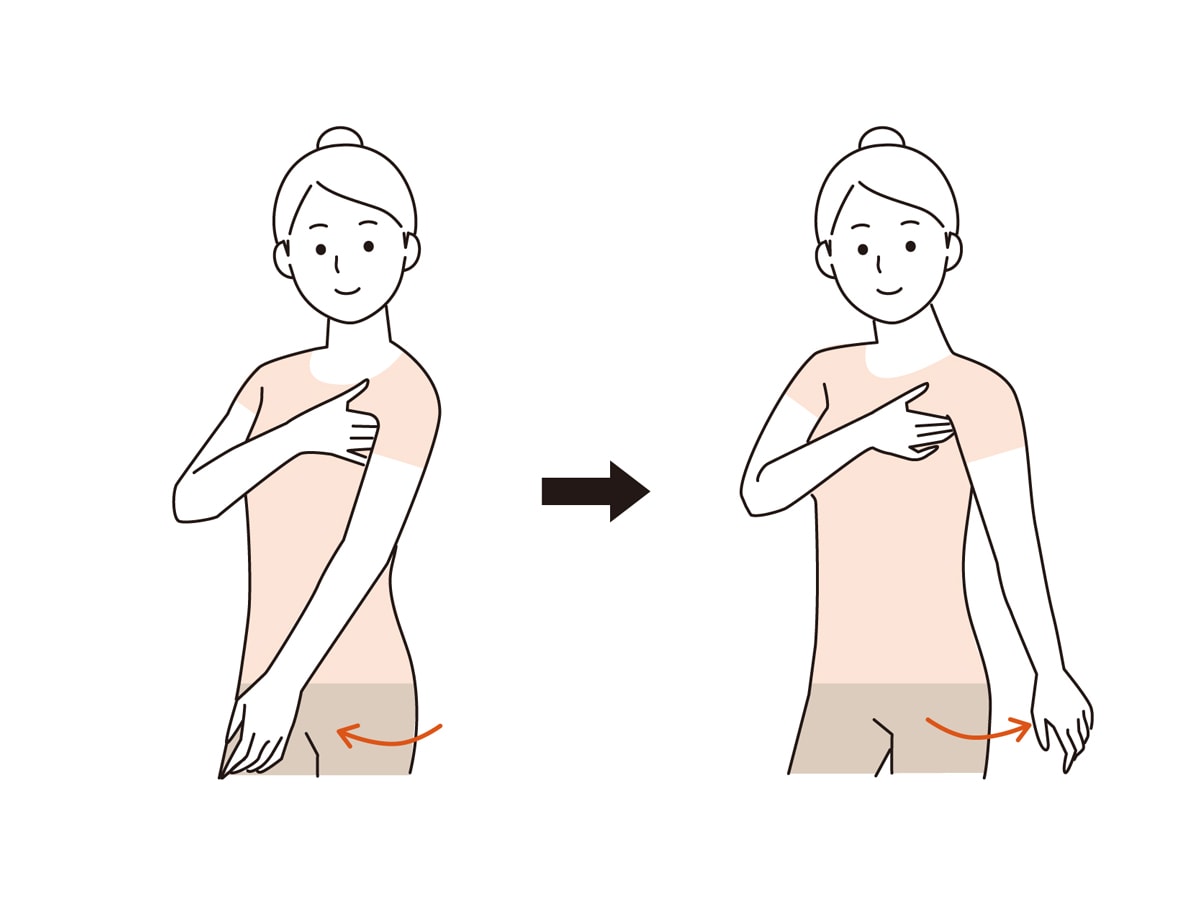 脇の筋肉をぎゅっとつかんだまま、腕を前後に動かします。前後で1セットとして20回行ってください。反対側も同様に。