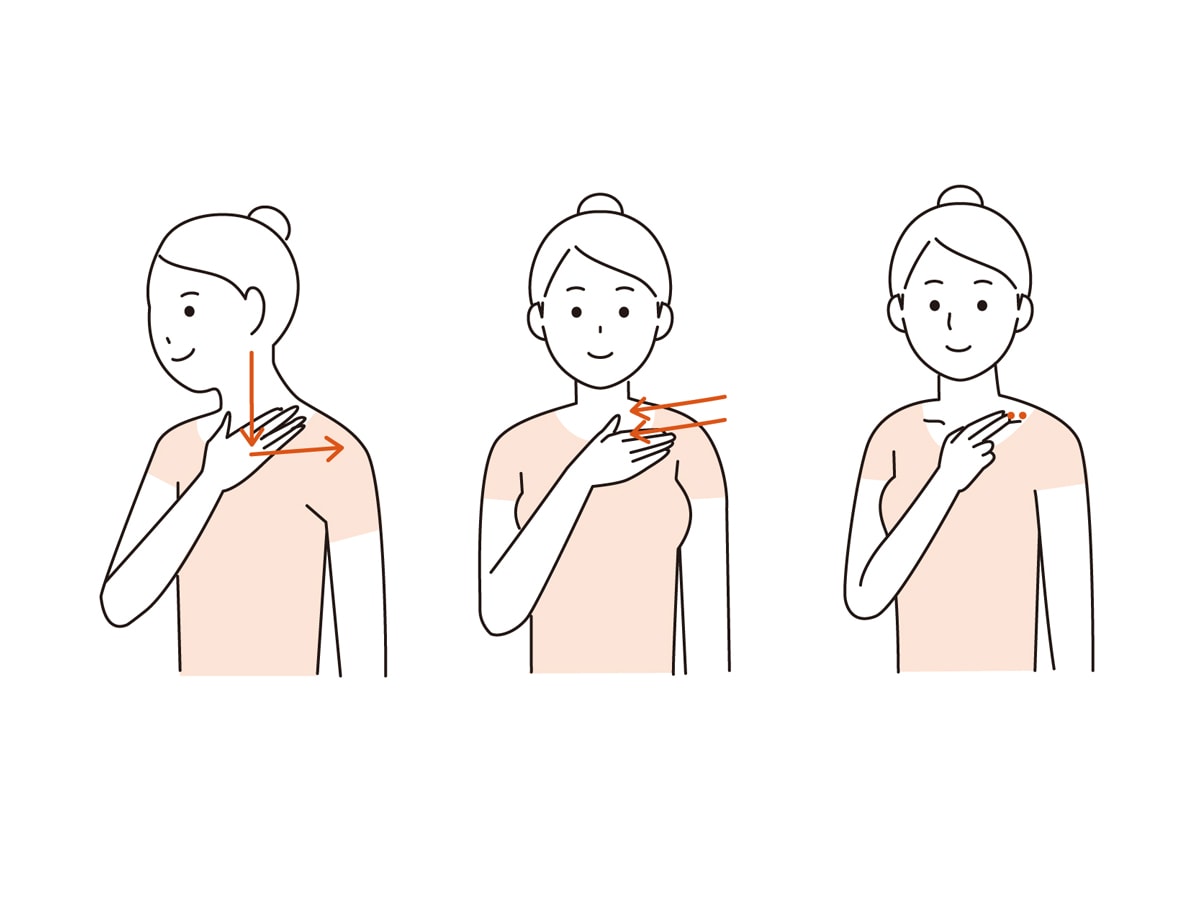 鎖骨のすぐ下を、外側から内側に向かって、指の腹で優しくさすります。
