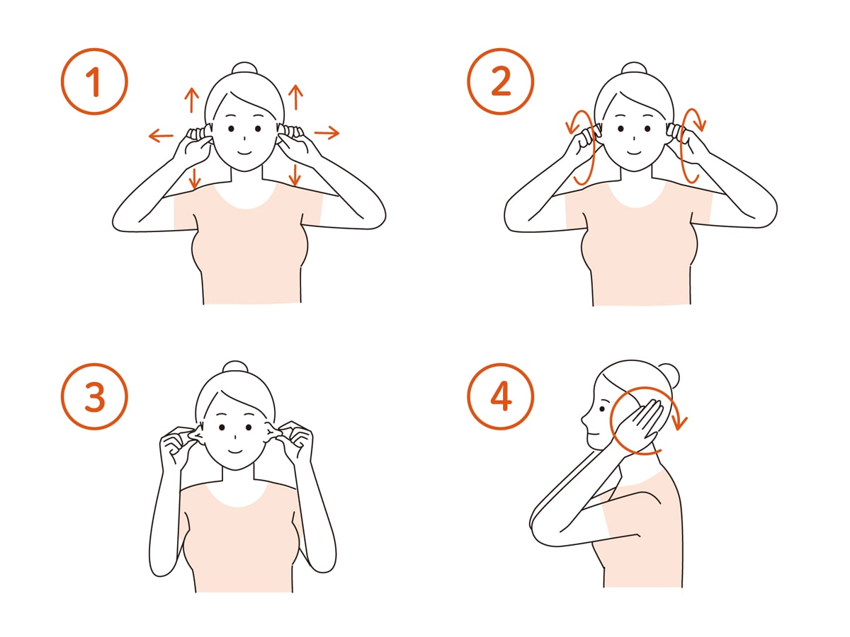 両耳を軽くつまみ、上・下・横に5秒ずつ引っ張りましょう。