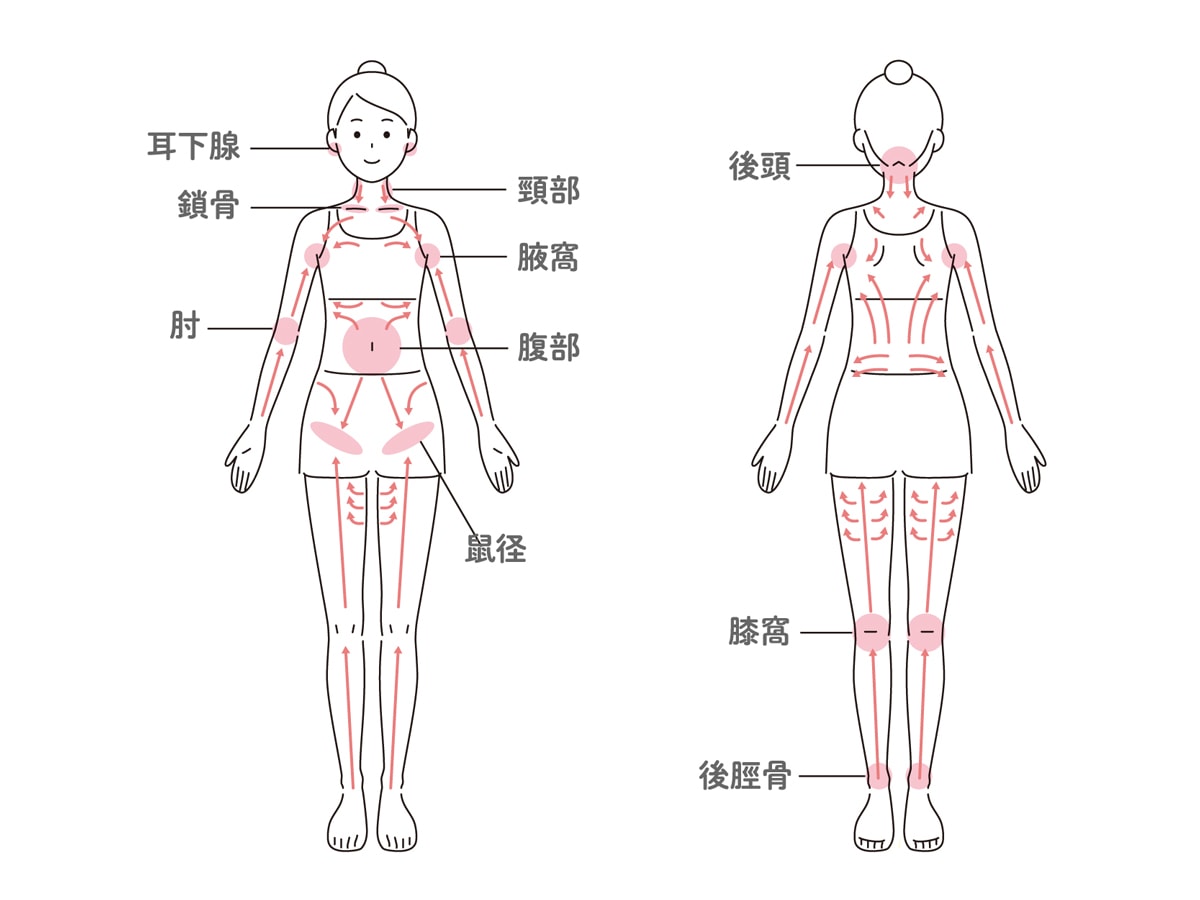 首、脇、鼠径(そけい)部などに節があり、心臓に向かって流れているので、リンパマッサージは末端から中心へ優しくさするのがポイント。